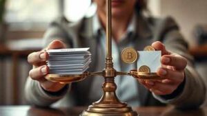 A subdued, realistic scene of a professional sitting at a desk with a laptop and printed job offer in hand, appearing thoughtful and slightly tense. The setting reflects a modern workspace, with muted lighting to convey uncertainty, symbolising the difficult trade-offs many workers face between financial security and career growth. Not long ago, switching jobs…